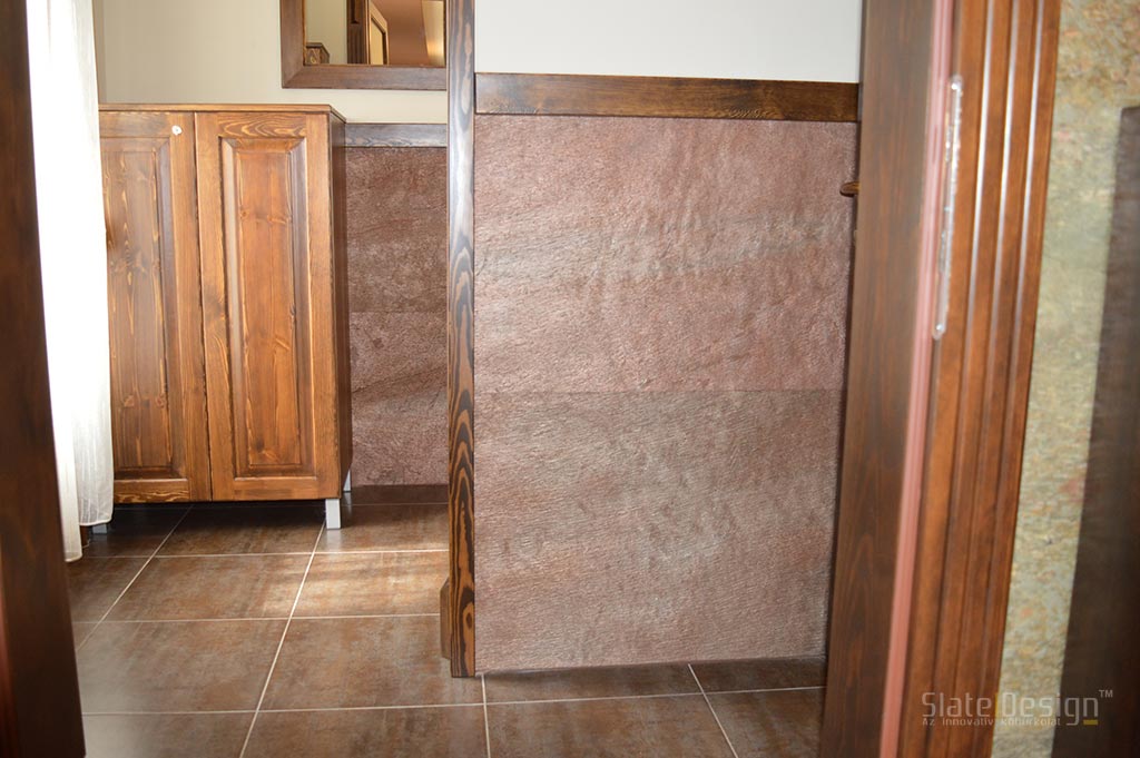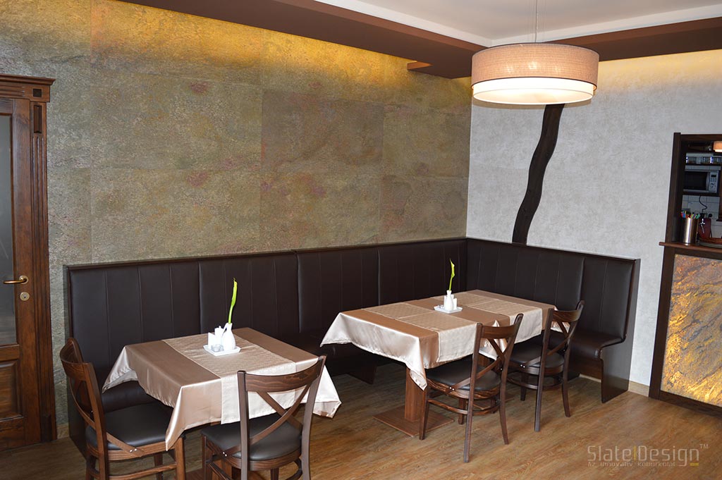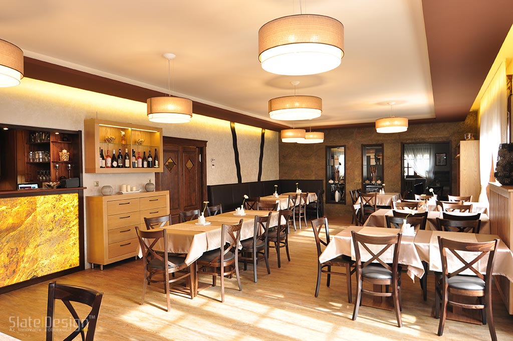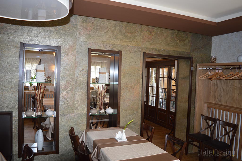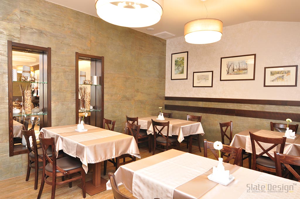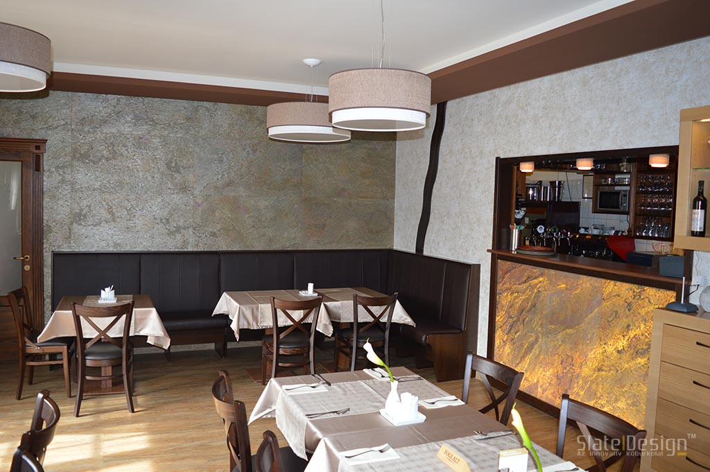 În restaurantul de pe malul Dunării, au fost utilizate utilizat plăci de furnir de piatră Slate Design cu mai multe feluri de structuri, pe baza ideilor designerului de locuințe Demeter Enikő și ale proprietarului. Tinzând spre perfecțiune, au acordat timpul necesar alegerii individuale a fiecărei plăci din oferta noastră.